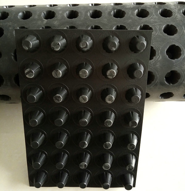 圆锥突台(或中空圆柱形多孔)的塑胶底板,由高抗冲聚苯乙烯(HIPS)制成。圆锥突台(或中空圆柱多孔)的顶面胶接一滤层土工布,以阻止泥土微粒通过,从而避免通道阻塞,使孔道排水顺畅。