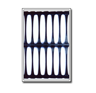 单向拉伸的土工格栅是由高分子聚合物经挤出压成薄板再冲规则孔网,然后纵向拉伸而成。这种过程中使高分子成定向线性状态并形成分布均匀、节点强度高的长椭圆形网状整体性结构。此种结构具有相当高的拉伸强度和拉伸模量,特别是我公司此类产品更具有高水平的高早期(伸长率在2%—5%)拉伸强度和拉伸模量。给土壤提供了理想的力的承担和扩散的连锁系统。该产品拉伸强度大(>150Mpa),适应各种土壤,是目前广为采用的加筋加固材料。